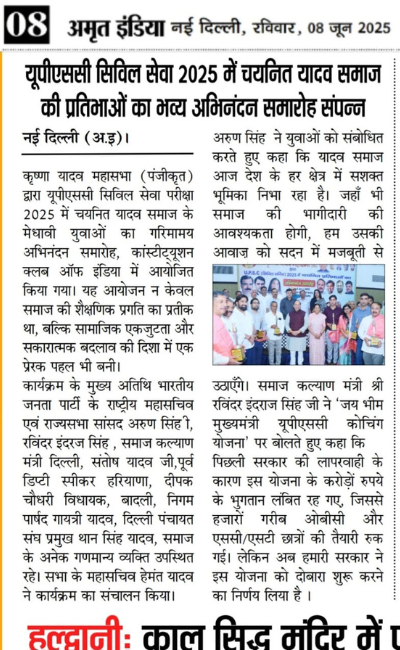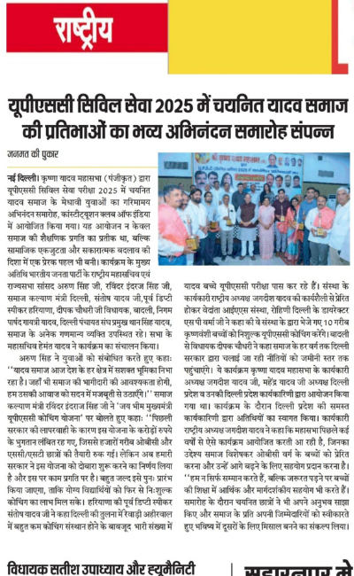श्री कृष्णा यादव महासभा (रजि) द्वारा 25 विधार्थियो को निशुल्क UPSC कोचिंग करवाई जा रही हैं। UPSC निशुल्क कोचिंग प्रवेश पत्र वितरण समारोह, दिनाँक 21 दिसंबर 25,रविवार, को कंस्टीटूशन क्लब ऑफ़ इंडिया , न्यू दिल्ली में आयोजित किया गया।